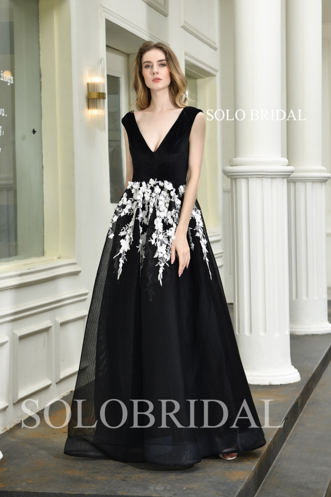 Black a line low V evening dress P243911