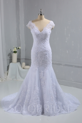 white V neck thin straps low back lace train crepe fit and flare wedding dre