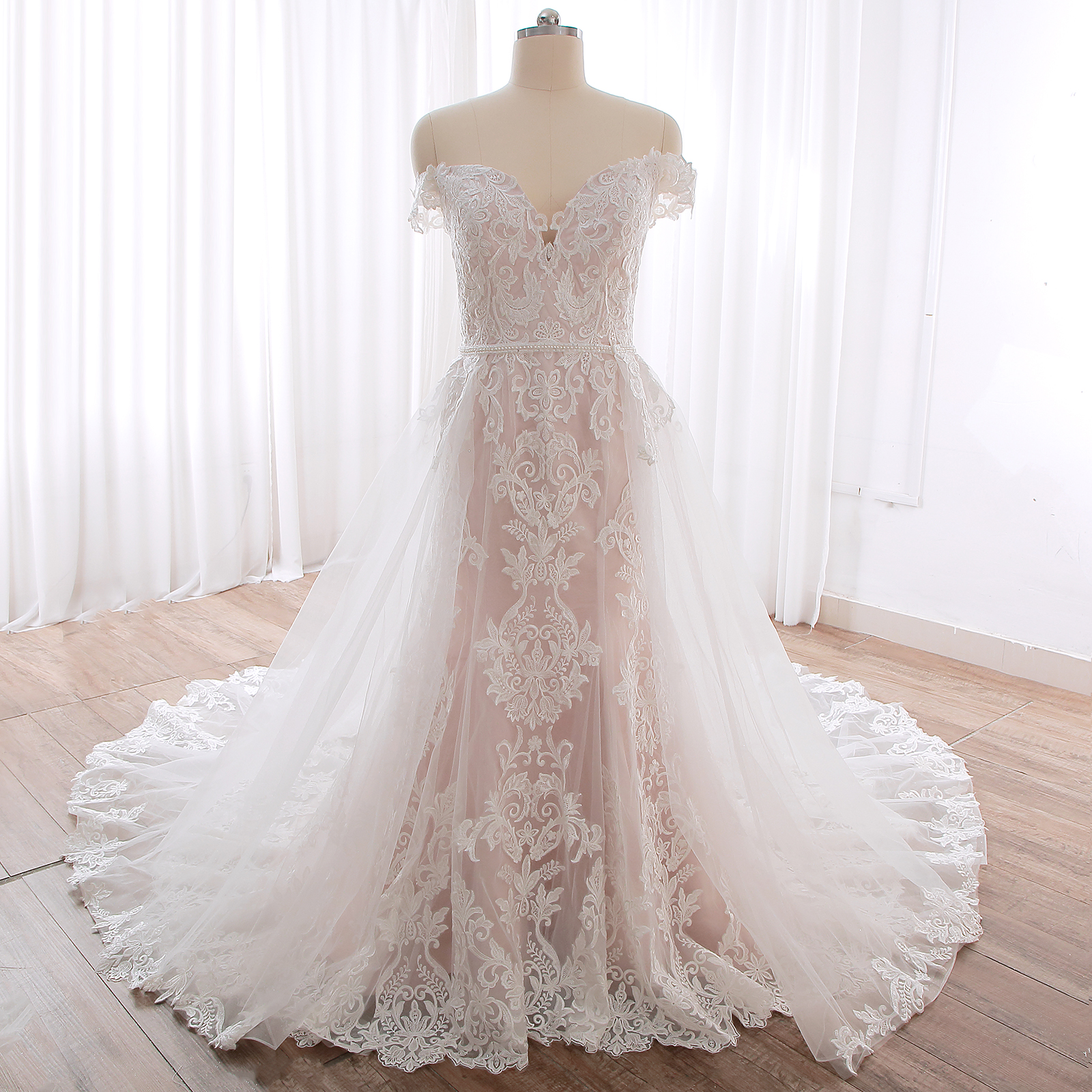 Blush Pink Off Shoulder A Line Removable Skirt Wedding Dress DPP_0018