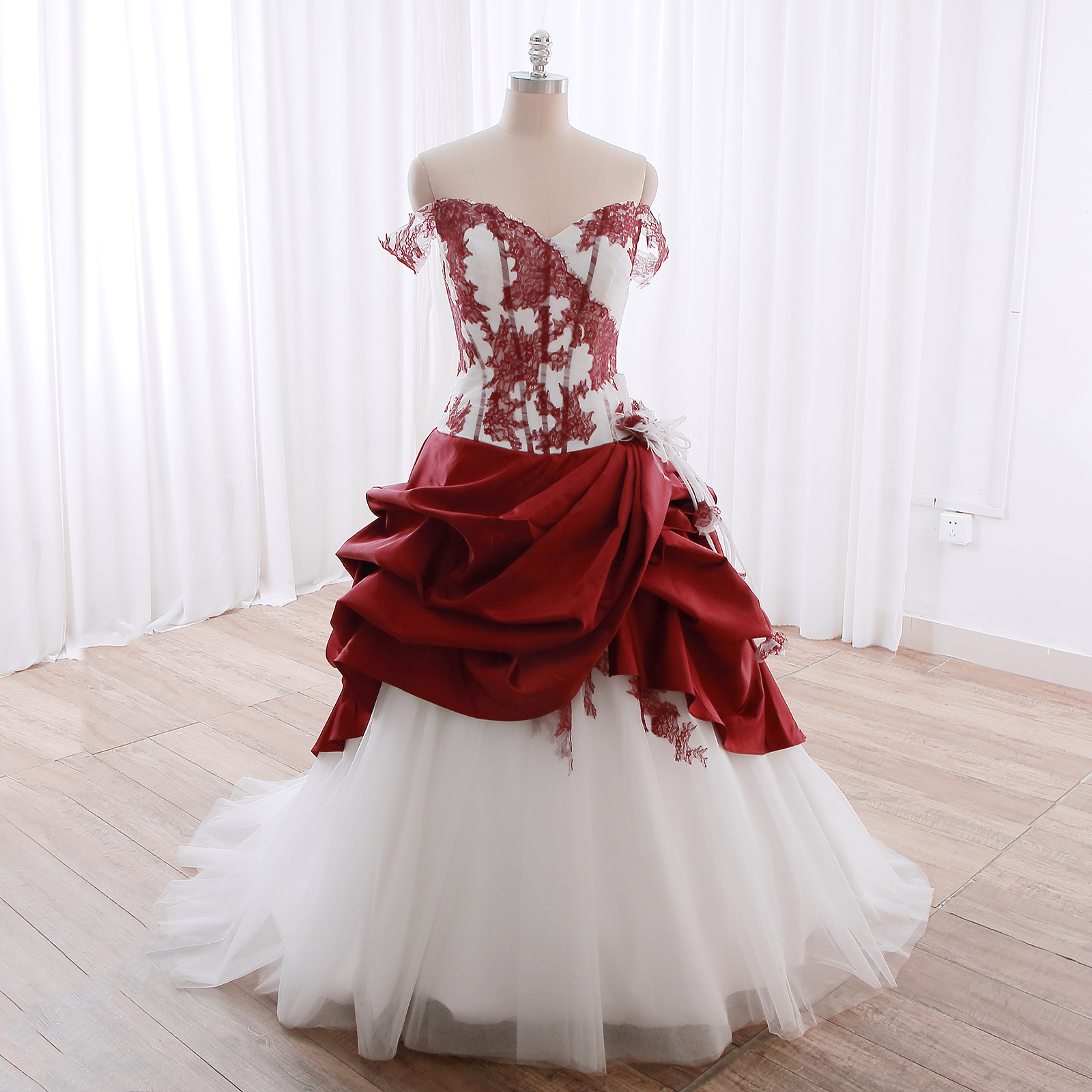 White Red Ball Gown Off Shoulder Taffeta Wedding Gown DPP_0037