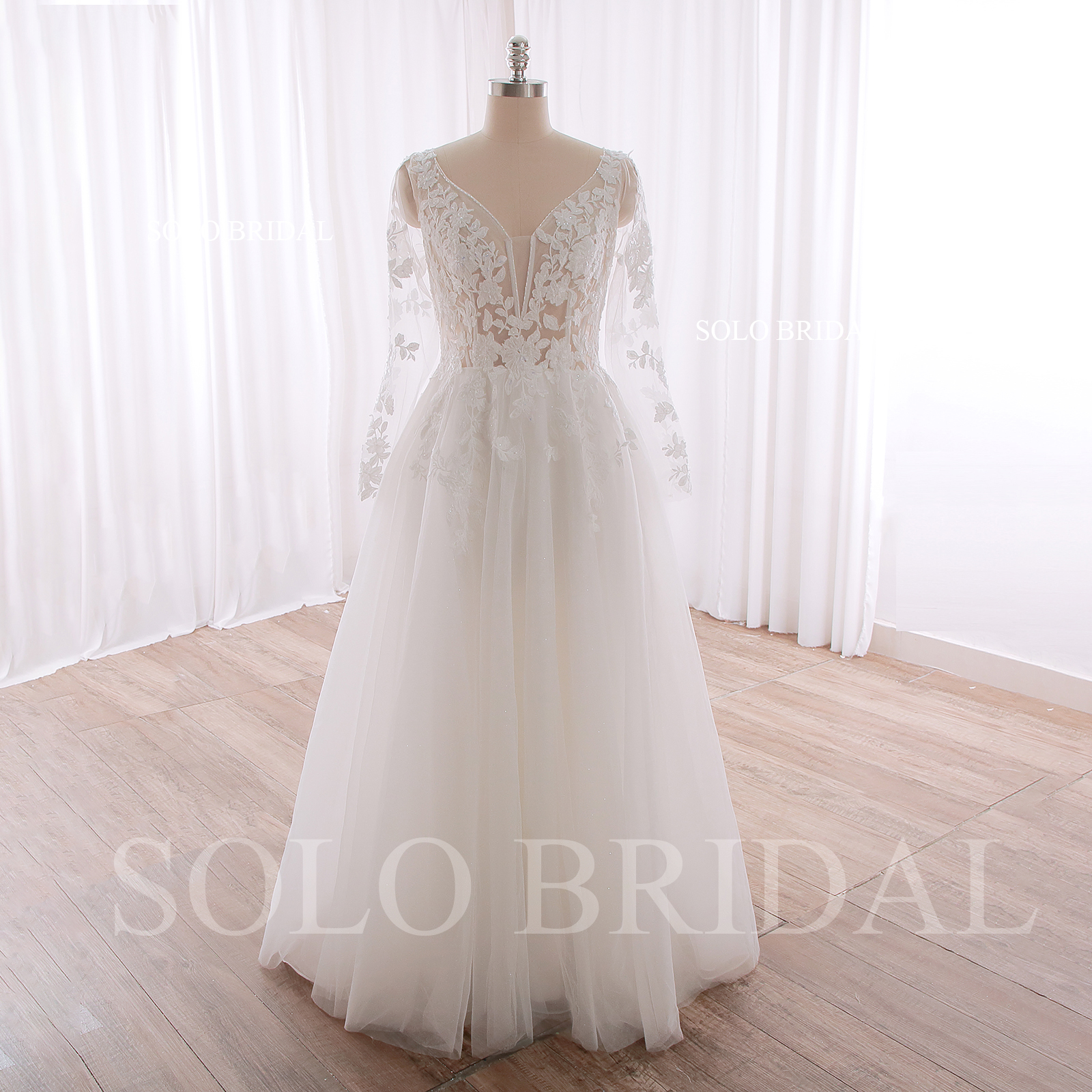 240402C Ivory V Neck Long Sleeve A line Floor Length Wedding Dress