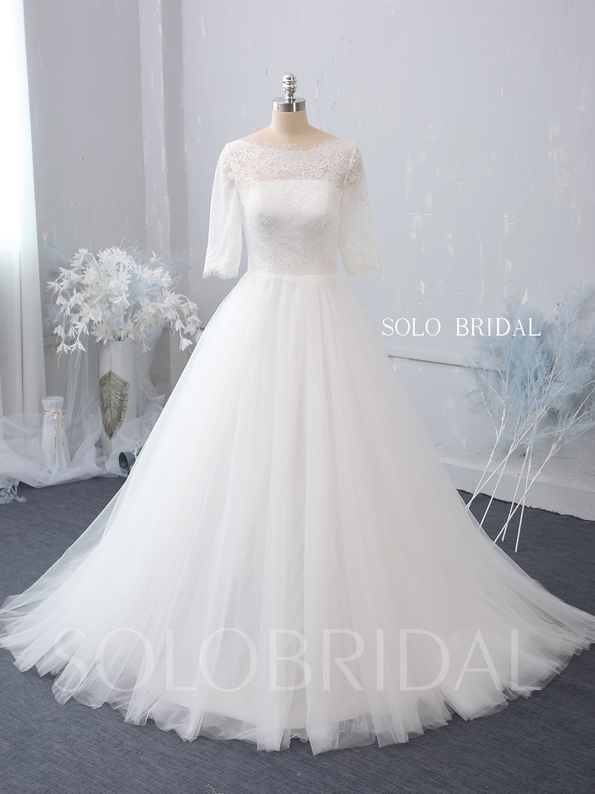 straight bustline half sleeves zipper buttons back sweep train ivory A line wedding dress 724A7402