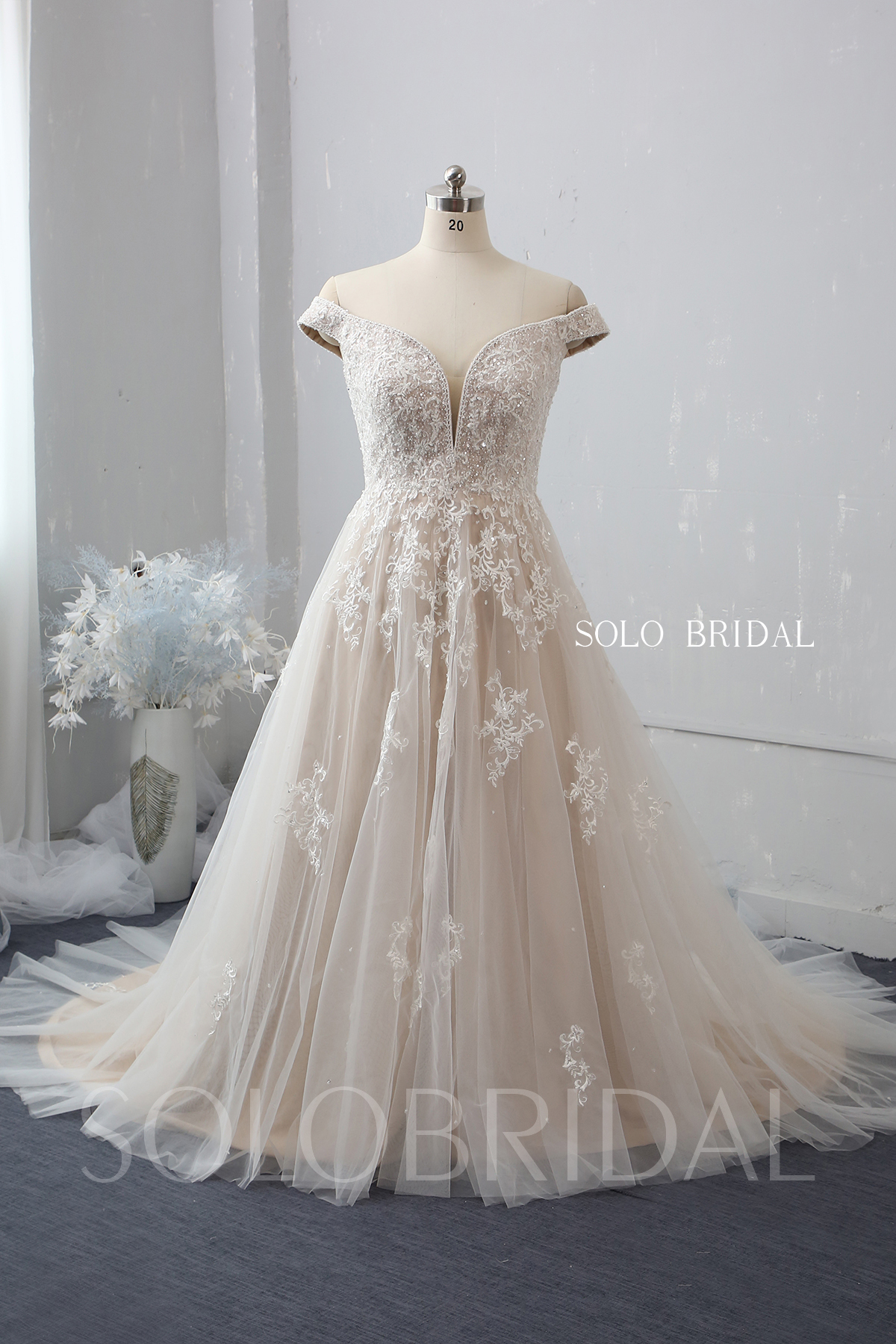 Dark Champagne off shoulder plunge neck A line wedding dress lace up back chapel train 724A8825