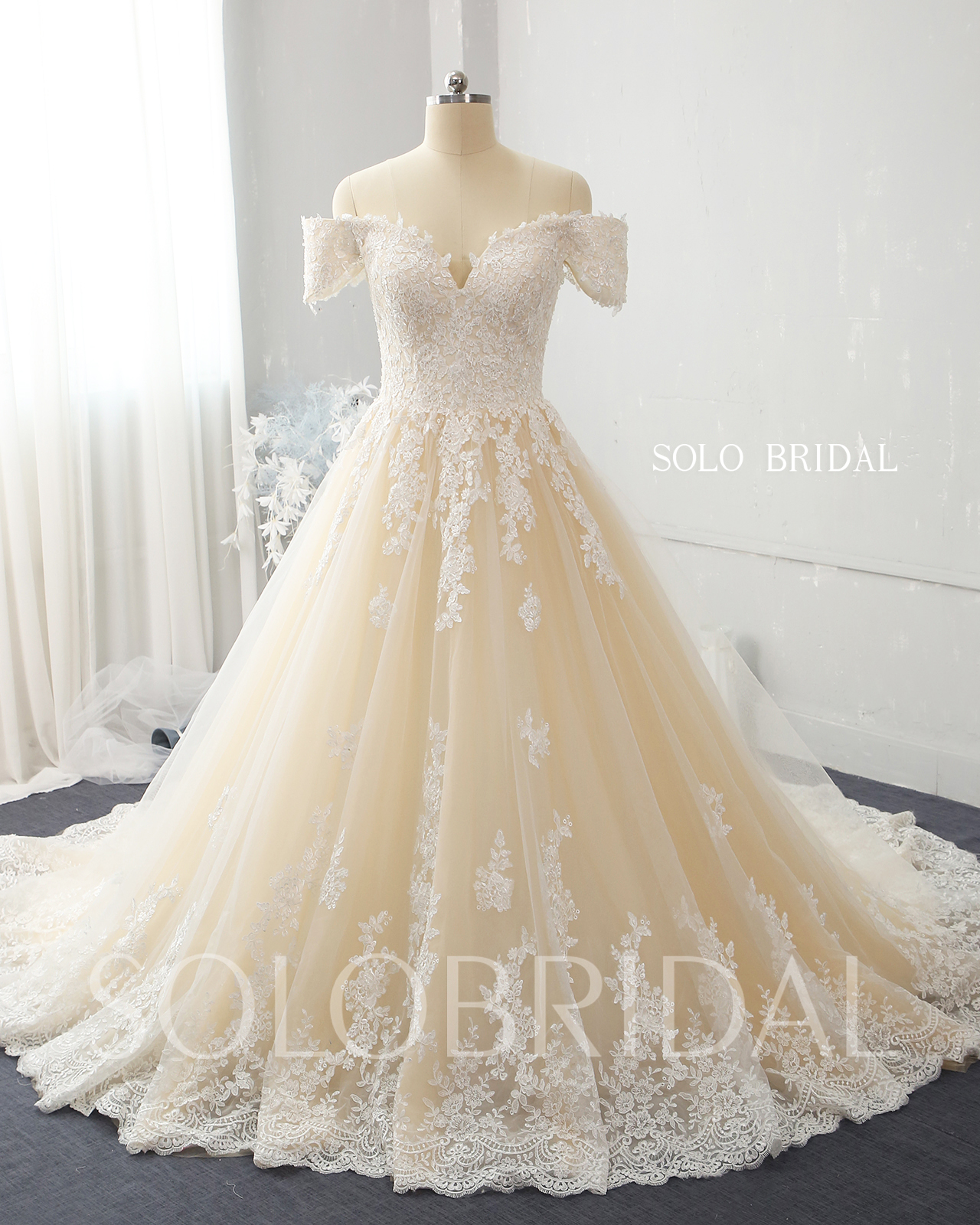 Champagne A line plunge neck off shoulder tulle lace wedding gowns 724A4805