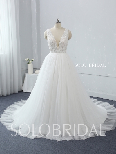 light ivory plunge V neck shoulder straps tulle skirt geometric cotton lace a line court train wedding dress 724A4213