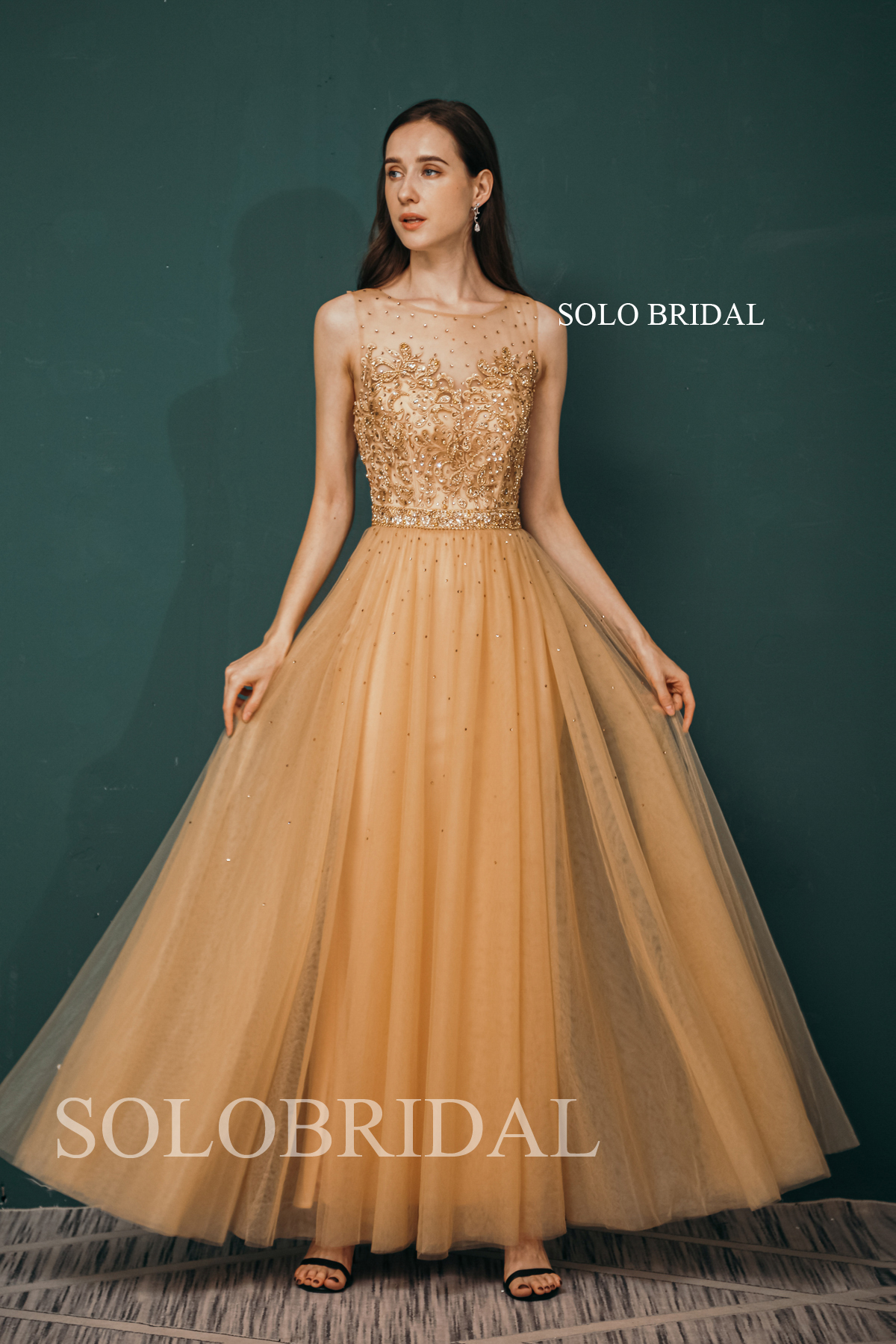 Gold A-line Illusion Neck Sleeveless Tulle Bridesmaid Dresses