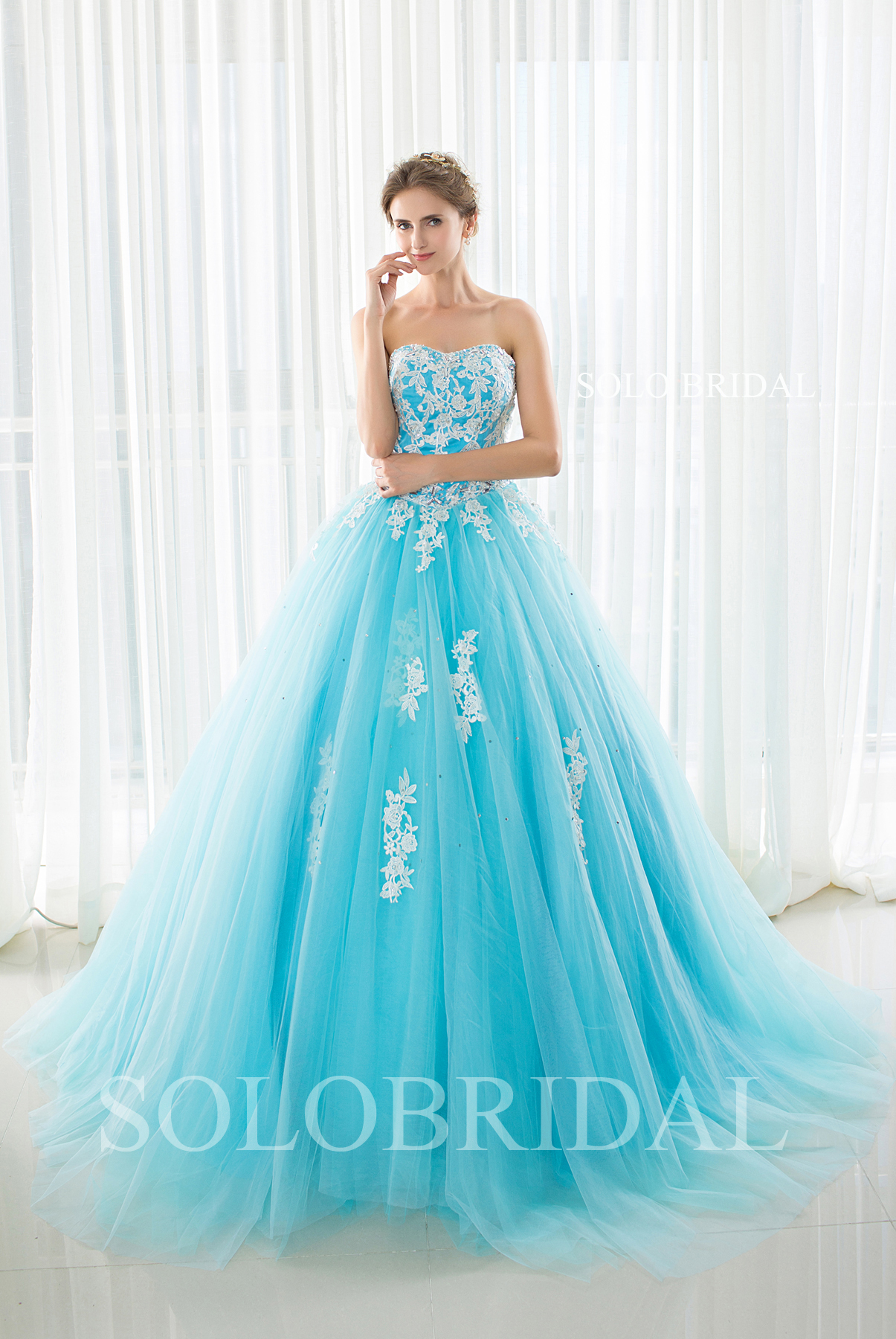 Sweetheart sky blue strapless lace up A line proom dress sweep train D342934