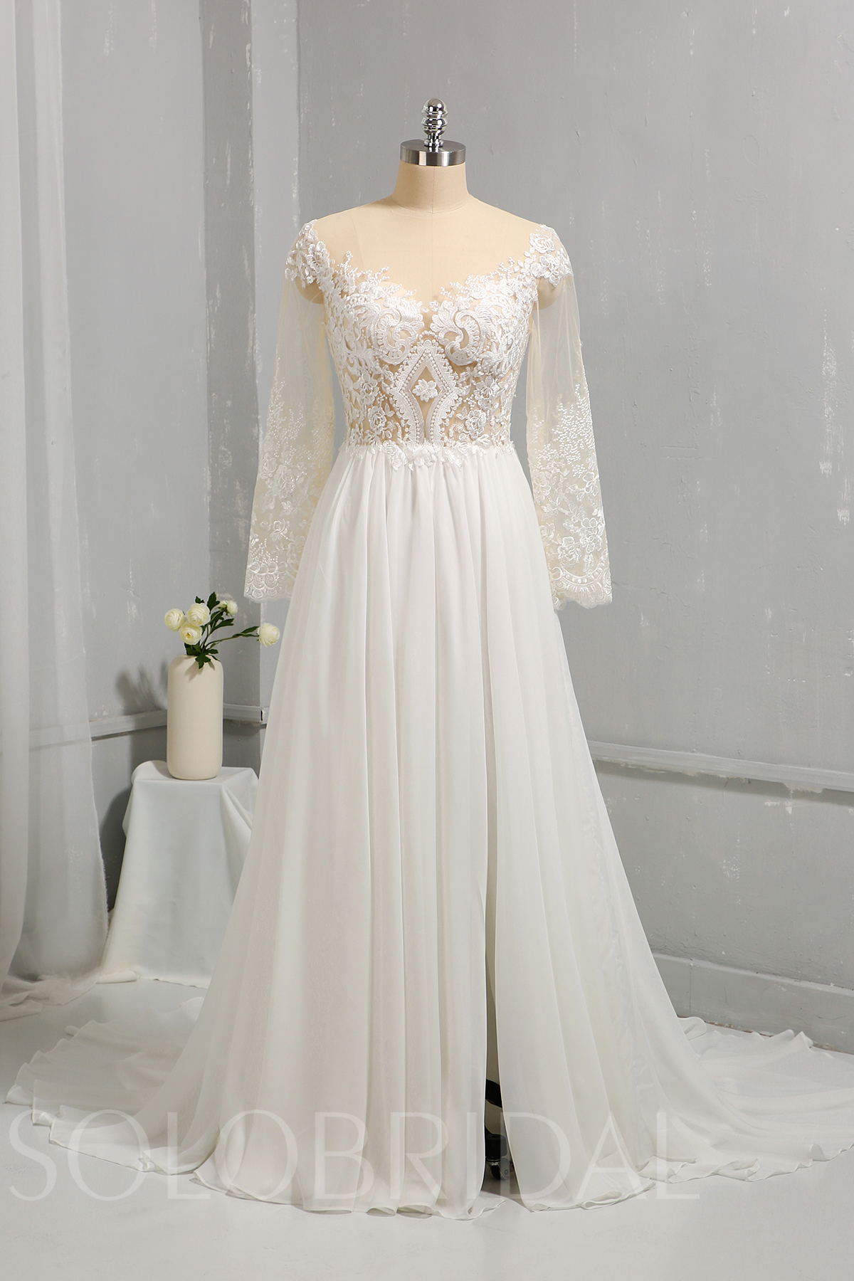 Ivory Chiffon Dress Tulle Long Sleeves with Slit 724A8037