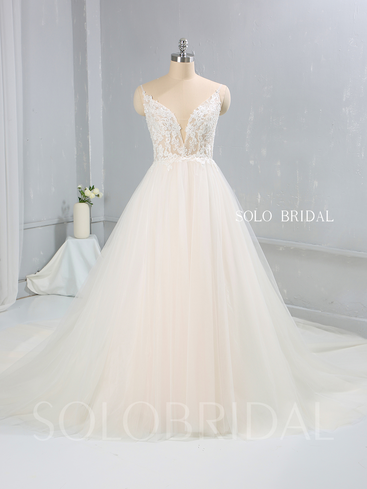 Light Champagne A Line Tulle Wedding Dress Cathedral Train 724A9961a