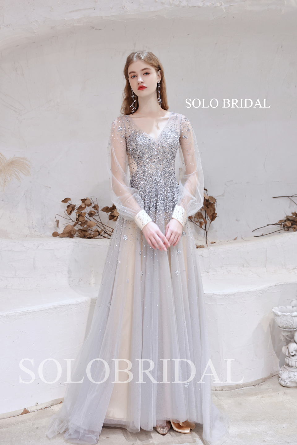 Champagne Silver Diamond Shiny A line Long Sleeve Dress T6610141