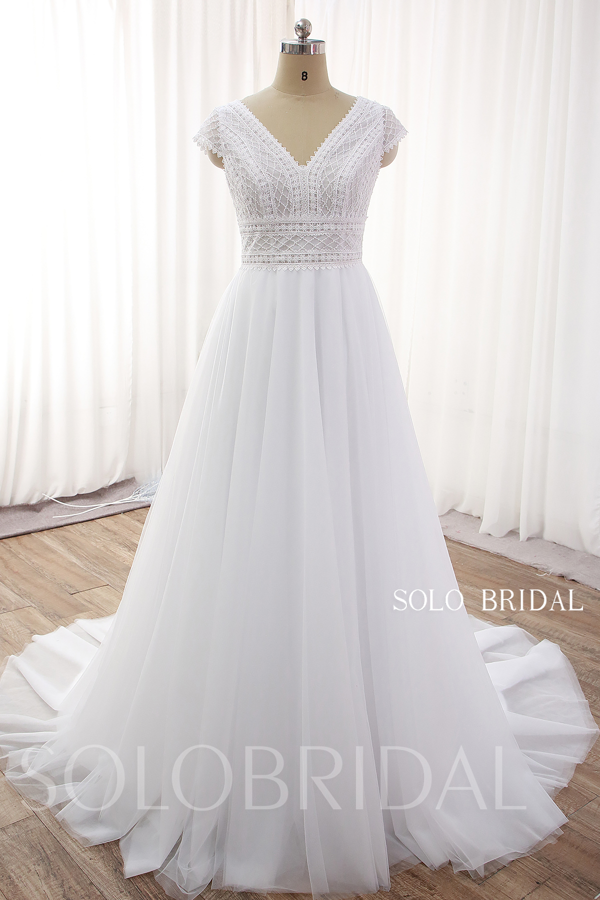 White A line Lace Tulle Wedding Dress with Chapel Train DPP_0035