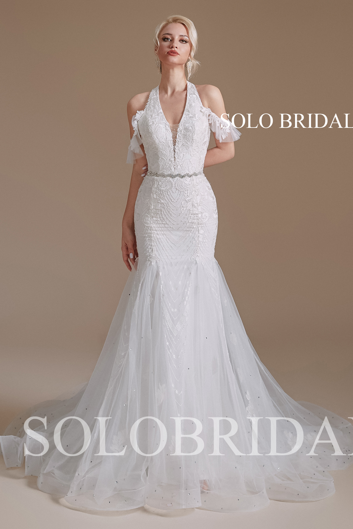 2110641 Ivory Halter Off Shoulder Fit and Flare Wedding Dress