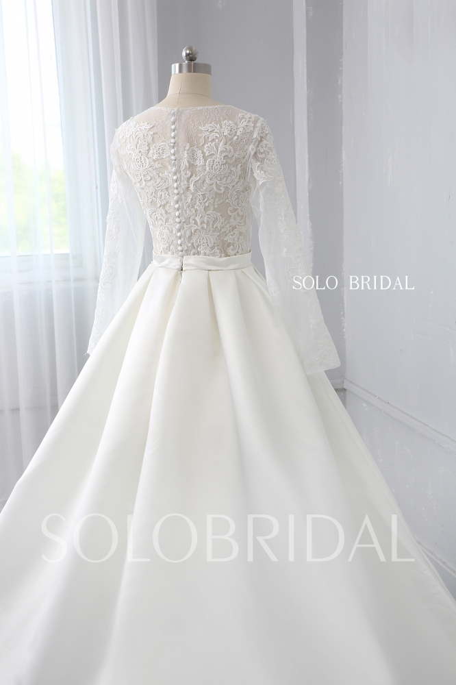 ivory lace bodice with long sleeves bridal satin skirt big pleats wedding dress 724A1181