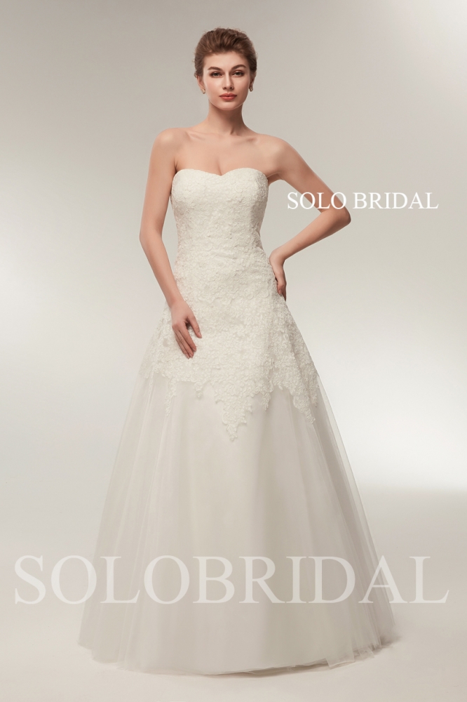 Dress Style A line Neckline Straight bustline Hem length floor length Sleeves sleeveless Support buid in bra and breast pads and bonings Fabrics lining satin tulle applique lace Train No Train Type of beads No Beads
