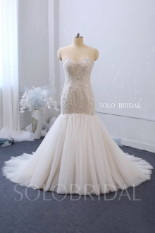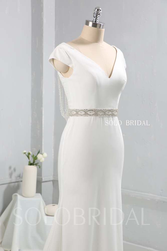 New design ivory beaded belt with pearl drapings crepe wedding dress 724A9482